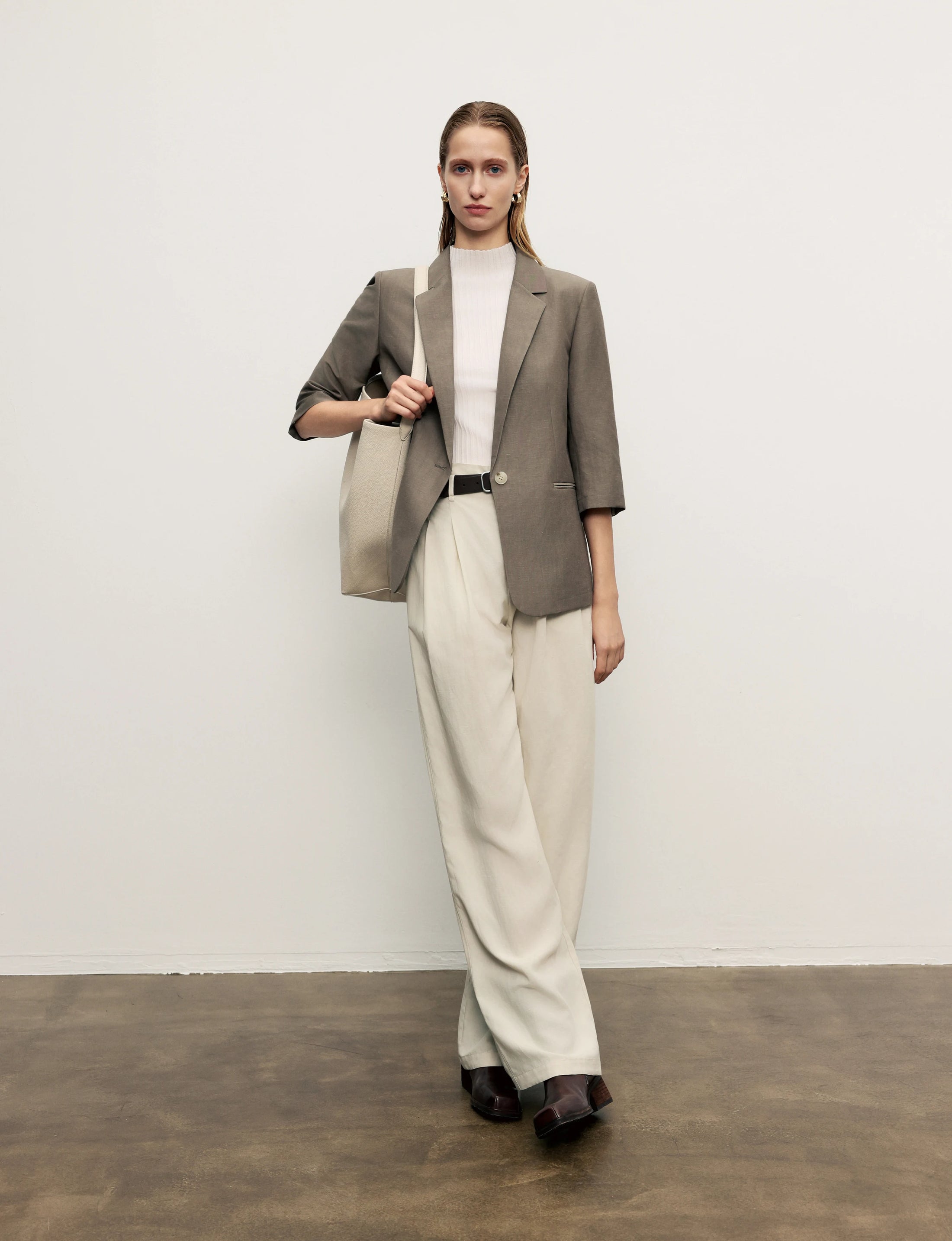 Ruched-Sleeve Cropped Tailored Blazer