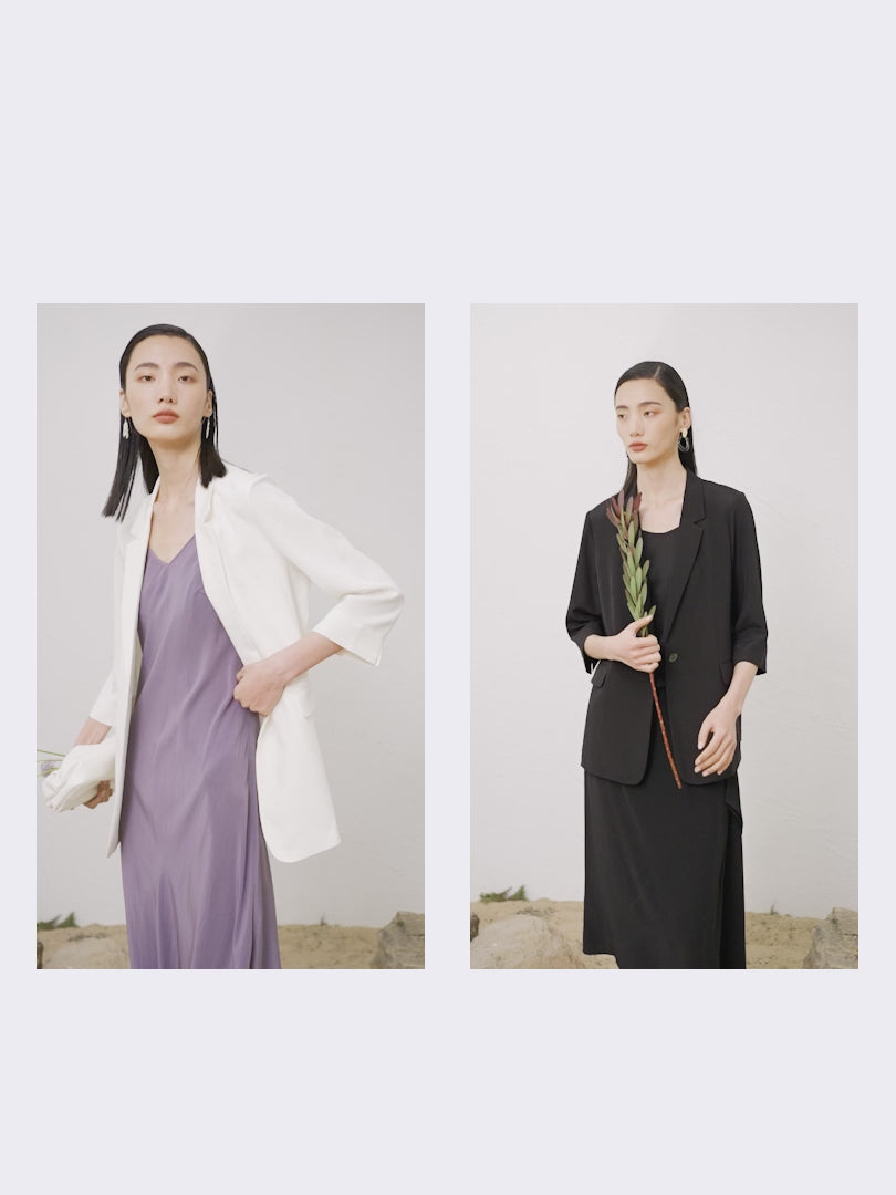 Premium silk blazer-style jacket with a lapel collar and 3/4-length sleeves. Crafted from high-quality mulberry silk, its mulberry silk lining adds a touch of comfort, while the addition of spandex provides a slight stretch for a perfect fit.